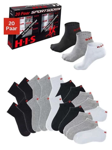 Mit dieser 20er Großpackungsbox sind Sie Ideal für den Sport und die Freizeit ausgerüstet. Immer die richtigen Sportsocken in genügender Menge zur Verfügung. Die klassischen Sportfarben schwarz, weiß und grau sind ideal zur jeweiligen Sportmode zu kombinieren. In dieser 20er Sport- Box erhalten Sie 10x Kurzsocken und 10x Sneakersocken zusammen, entweder alle in schwarz oder in der gemischten Farbpackung.Hier erhalten Sie:4x schwarze Sneakersocken, 3x grau Sneakersocken, 3x weiße Sneakersocken und 4x schwarze Kurzsocken, 3x graue Kurzsocken, 3x weiße Kurzsocken.Unsere Sport- und Freizeitsocken mit dem Plus an Tragekomfort: Weiches Frottee und Verstärkung der Belastungszonen vermeiden Druckstellen, die feuchtigkeitsregulierende Materialkomposition schafft ein fußgesundes Klima. Die sportliche Rippenstruktur garantiert guten Sitz und sorgt für eine optimale Passform. Pflegeleichte Qualität und Farbbrillanz inklusive. Ideal für aktive Freizeitfans. Die attraktive Sport- Box ist dazu eine schöne Geschenkidee für alle Sport und Freizeitfans.Details:Sport- und FreizeitsockenIn der praktischen 20er- GroßpackungIn einer Packung Kurzsocken und SneakersockenFür sie + ihnDauerhafte FarbbrillanzPflegeleichte QualitätSchweißaufsaugend danke weichem Fußfrotteemit eingesticktem H.I.S-LogoDrei-Faser-Qualität – Großpackung Unisex-Socken mit unterschiedlichen Längen – 10 Paar Kurzsocken und 10 Paar Sneakersocken – Mit weichem Fußfrottee – Eingesticktes Logo über der Ferse – Angenehme Baumwollqualität