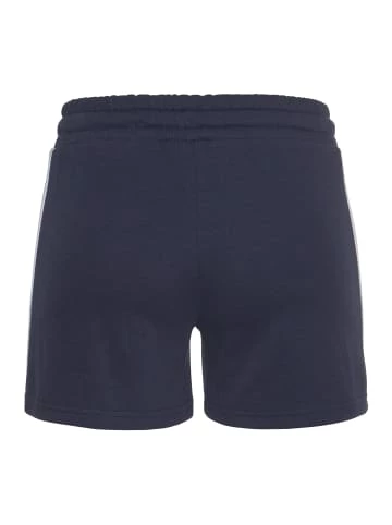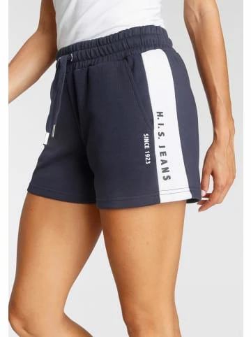 Knackig-kurze Sweatshorts von H.I.S. Breite Kontraststreifen mit Labelprint seitlich. Elastischer Kordelzugbund. Seitliche Eingrifftaschen. Schön für warme Tage. Weiche Interlockqualität. – Sportliche Shorts in Interlock – Mit weißem seitlichem Streifen – Logoschriftzug als Druck – Seitliche Eingriffstaschen