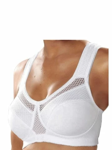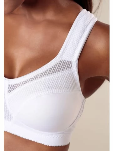 Mit gemusterten Netzeinsätzen. Aus hochwertigem COOLMAX®-Material für einen optimalen Feuchtigkeitstransport. Breite, gefütterte Träger und breiter Rücken für hohen Tragekomfort – auch in großen Größen. Rückenverschluss verstellbar. Für mittlere Belastbarkeit. Klassische Dessous. Bequeme Alltags-Dessous. Modische Dessous. Aus 90% Polyester (COOLMAX®), 10% Elasthan. BHs sind nicht trocknergeeignet, da die Versteller und Ringe durch die Hitze beschädigt werden und brechen. – Sport-BH ohne Bügel für mittlere Belastbarkeit – Aus schnell trocknendem COOLMAX®-Material – Breite weich gepolsterte Träger sorgen für einen optimalen Halt bei gleichzeitiger Entlastung der Schultern – ideal für große Größen – Sportliche Netzeinsätze entlang der Cupkanten – Rückenverschluss 3-fach verstellbar