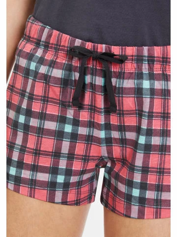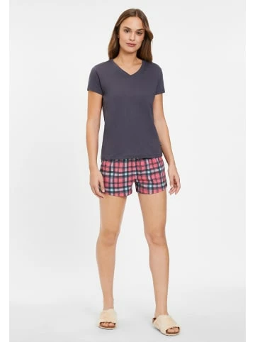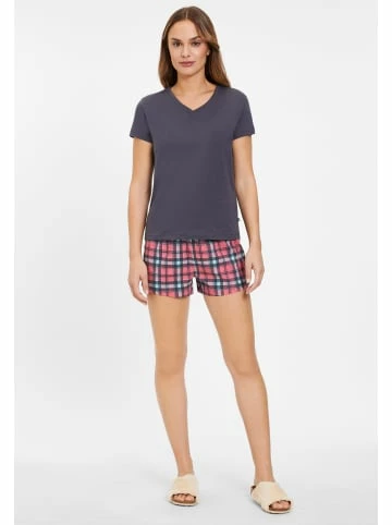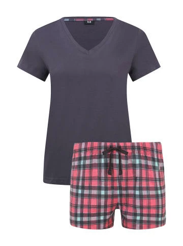 Kurzarmshirt mit V-Ausschnitt. Shorts mit bedrucktem Karomuster und elastischem Hosenbund. Aus weichem Single Jersey aus 100% Baumwolle. – Lässiger kurzer Pyjama – Kurzarmshirt mit V-Ausschnitt – Kleines Flag-Logo in der Seitennaht – Shorts mit elastischem Tunnelzugbund – Aus weichem Single Jersey aus 100% Baumwolle